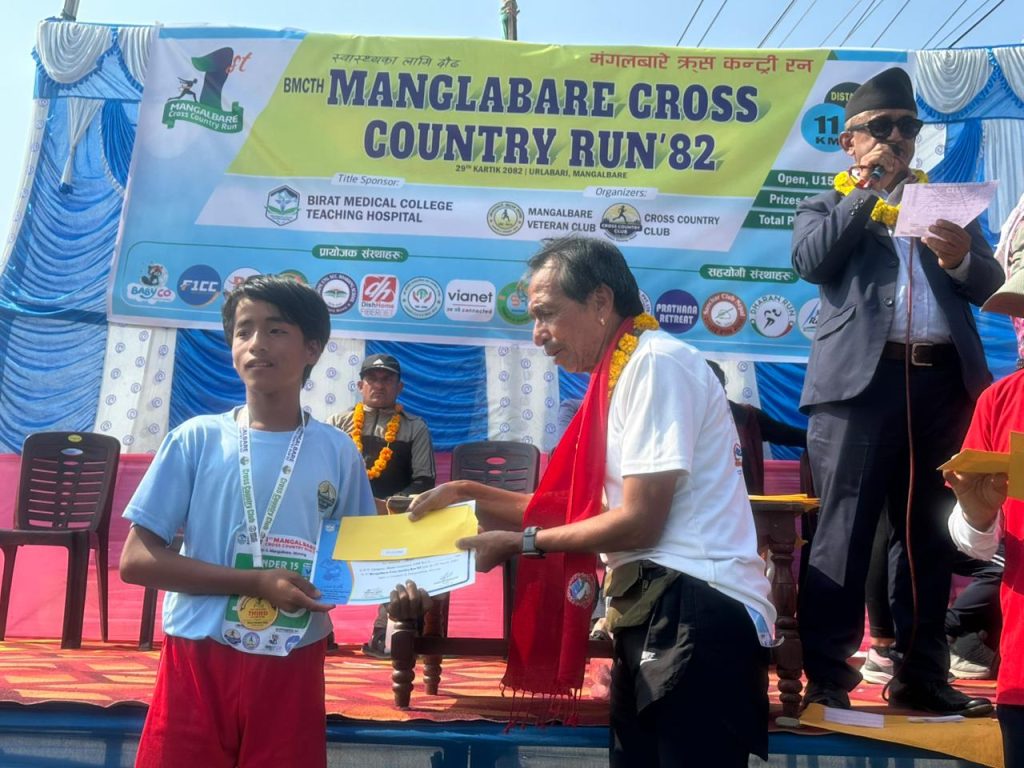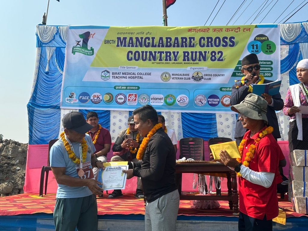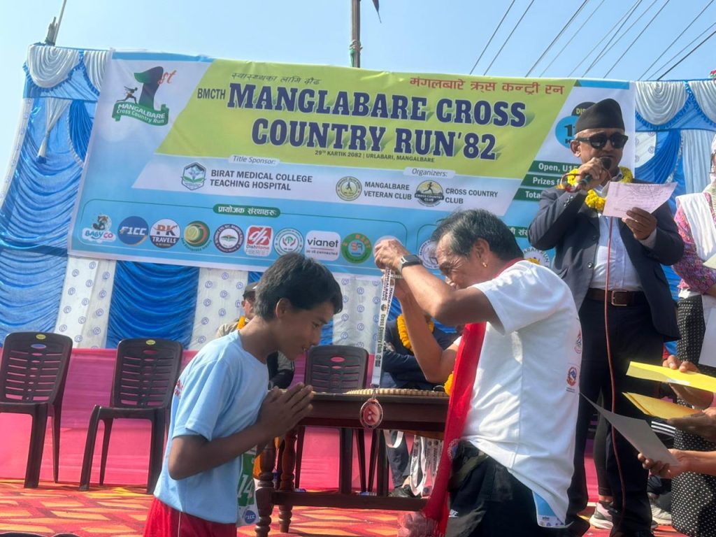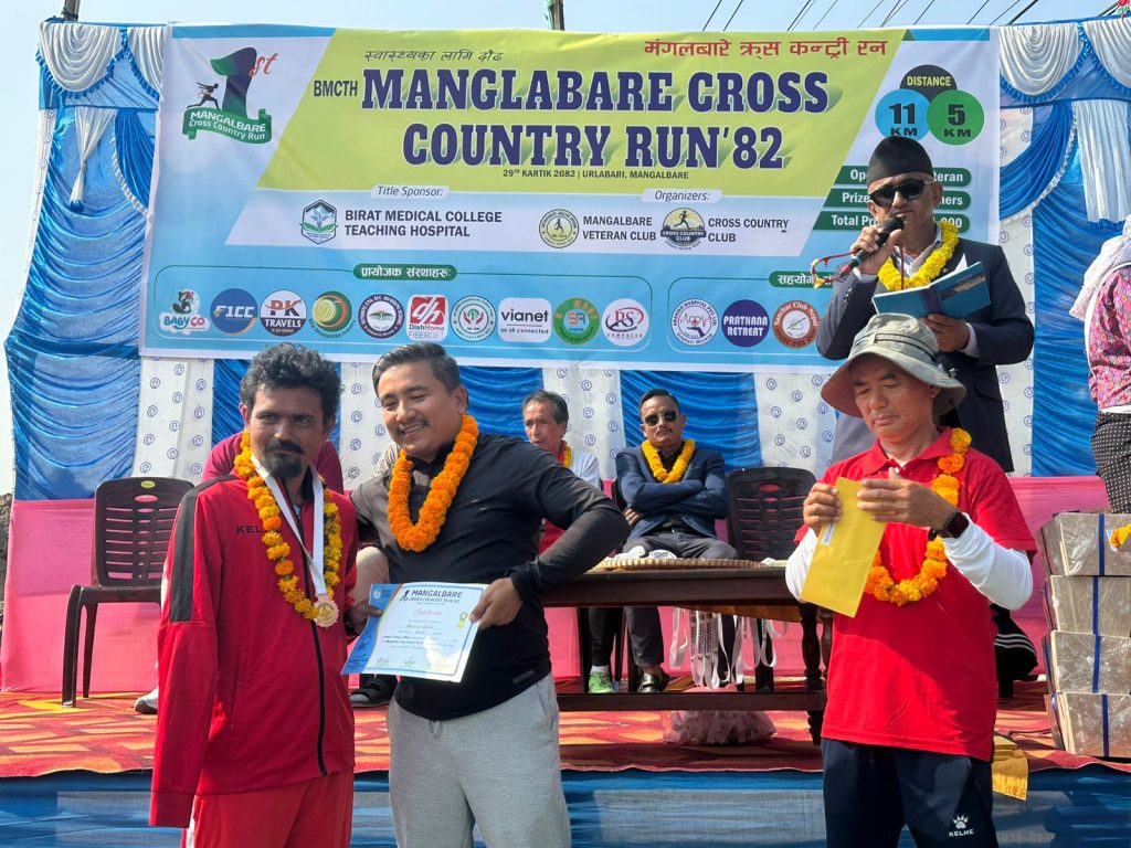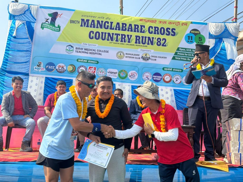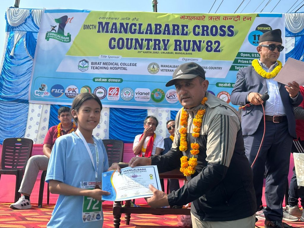 उर्लाबारी,मोरंग – फाल्गुनन्द जयन्तीको अवसरमा उर्लाबारी नगरपालिका–३ मा पहिलो पटक आयोजित “बिराट मेडिकल कलेज टिचिङ हस्पिटल (B.M.C.T.H.) प्रथम मंगलबारे क्रस कन्ट्री रन–२०८२” भव्य रूपमा सम्पन्न भएको छ। विभिन्न उमेर समूह तथा विधाहरुमा कुल ४२१ धावक–धाविकाको सहभागिता रहेको यो प्रतियोगिता सफलतापूर्वक सम्पन्न भएको हो।